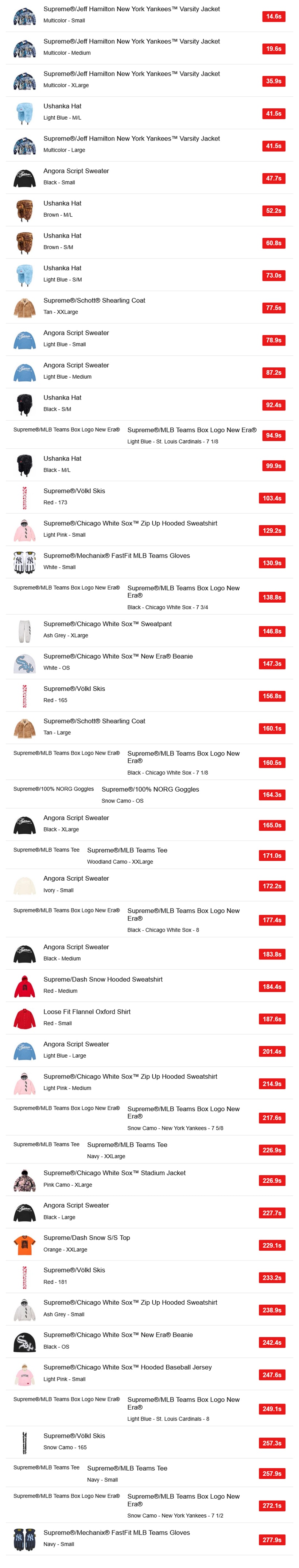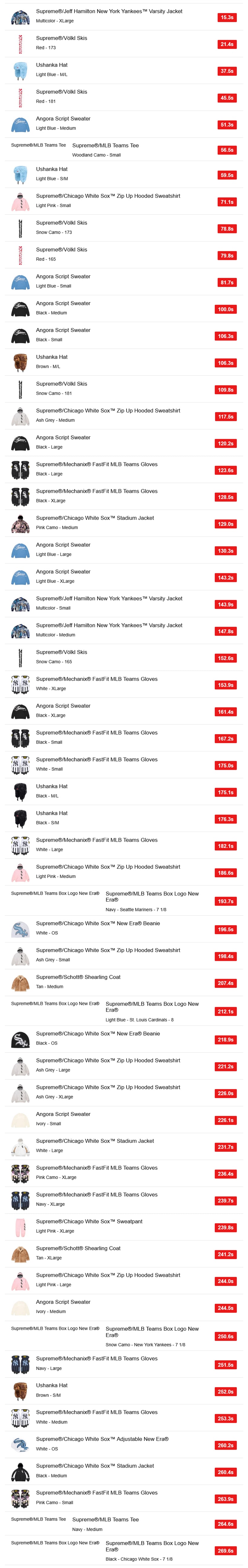 海外ではバーシティジャケット「Supreme®/Jeff Hamilton New York Yankees™ Varsity Jacket」、セーター「Angora Script Sweater」、ハット「Ushanka Hat」あたりの人気が高かったようだ。